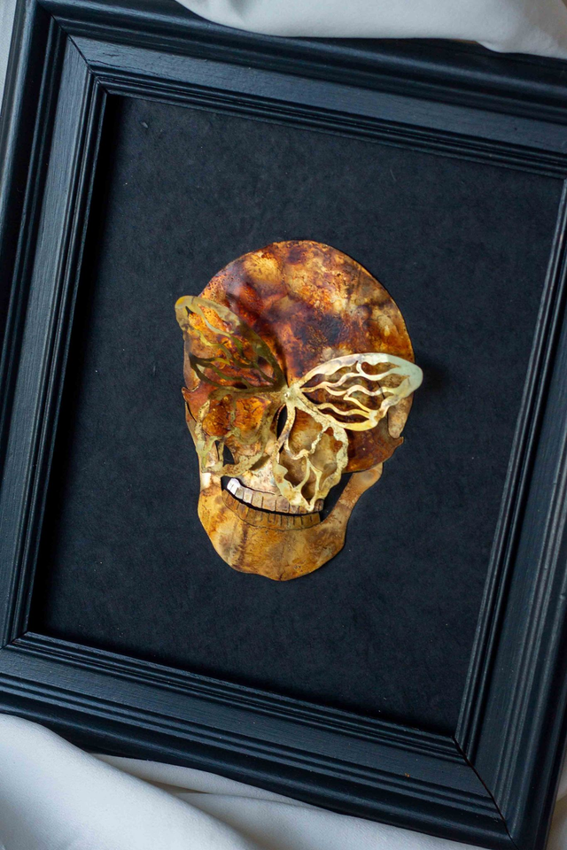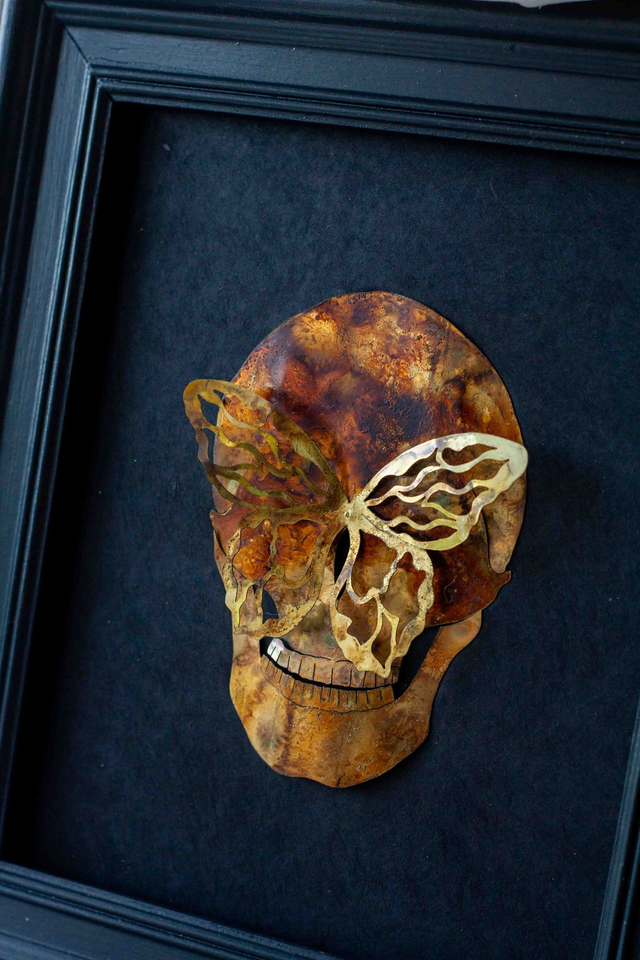 Illustration en laiton dessinée et découpée à la main. Oxydation sans produit chimique . Cadre ancien sans vitre en bois noir.