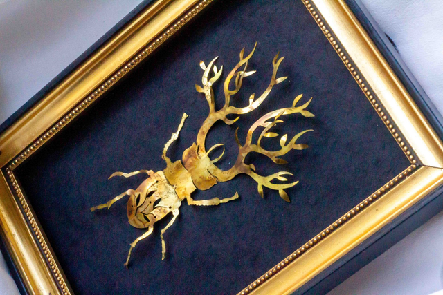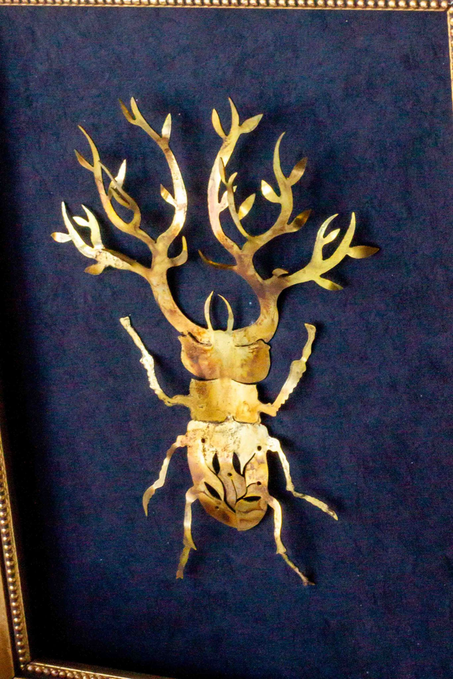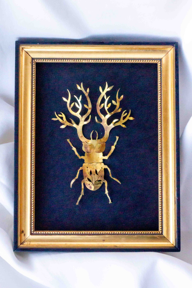 Illustration en laiton dessinée et découpée à la main. Oxydation sans produit chimique . Cadre ovale ancien en bois doré.