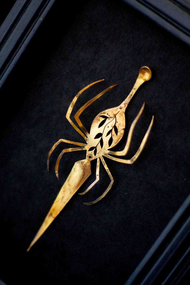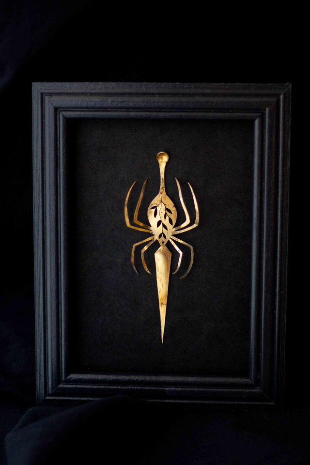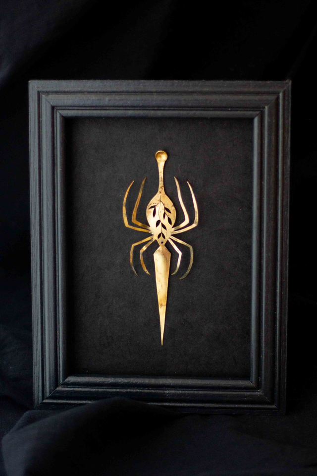 Illustration en laiton dessinée et découpée à la main. Oxydation sans produit chimique .