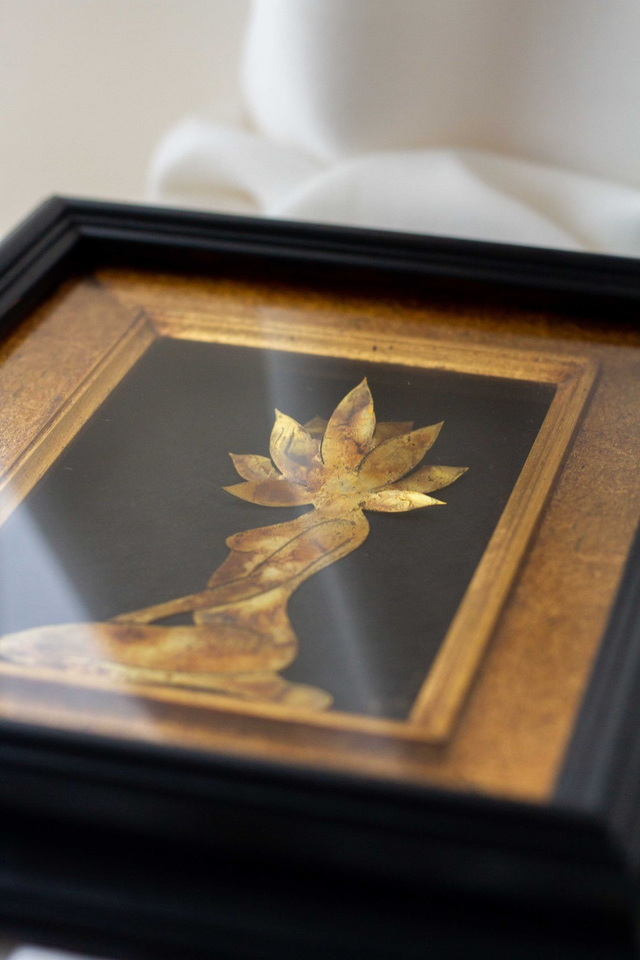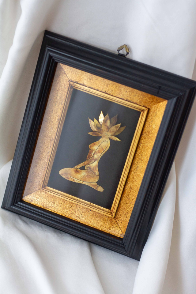 Illustration en laiton dessinée et découpée à la main. Oxydation sans produit chimique . Cadre ancien vitré en bois noir et intérieur doré .
