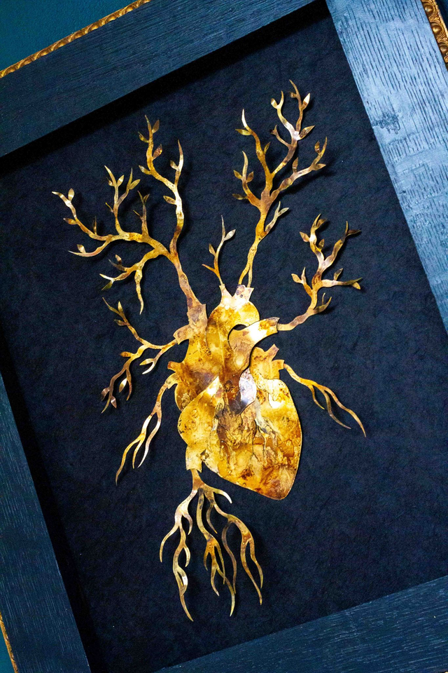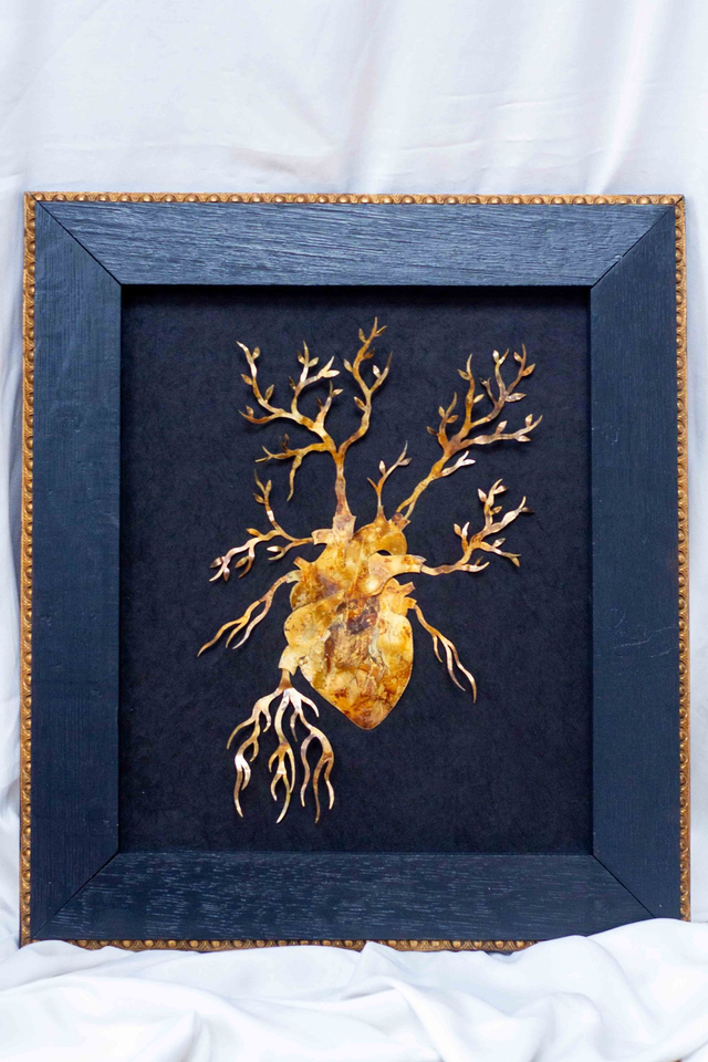 Illustration en laiton dessinée et découpée à la main. Oxydation sans produit chimique . Cadre ancien sans vitre en bois noir.