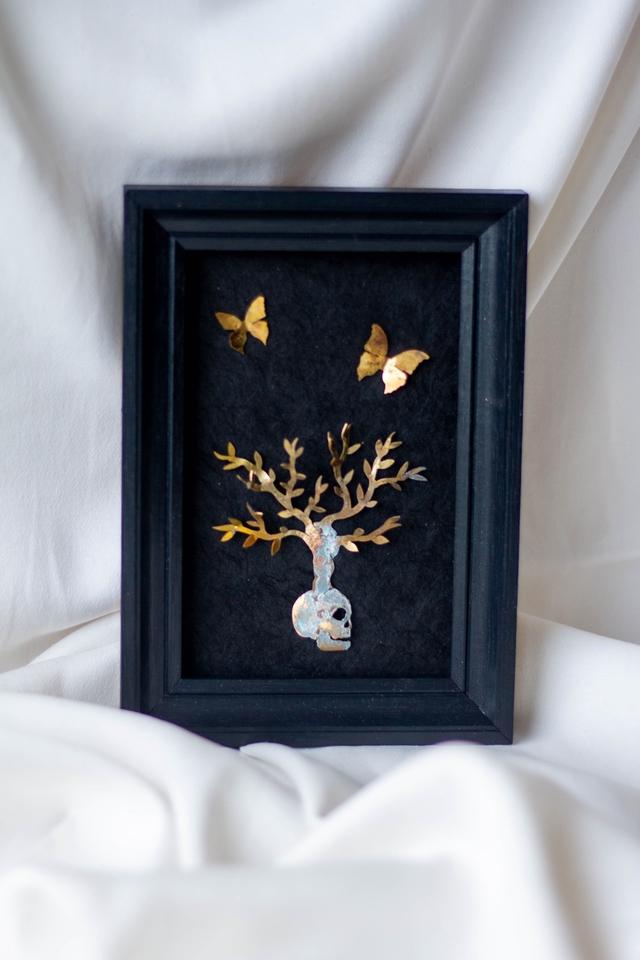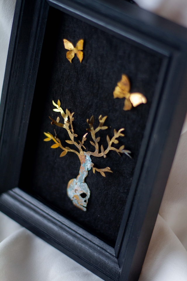 "Ce tableau incarne le cycle éternel où la mort et la vie se croisent harmonieusement. Les papillons sont ici les messagers d'une renaissance après le trépas.