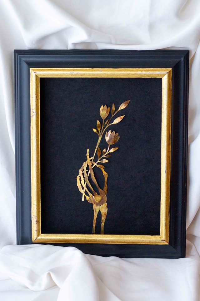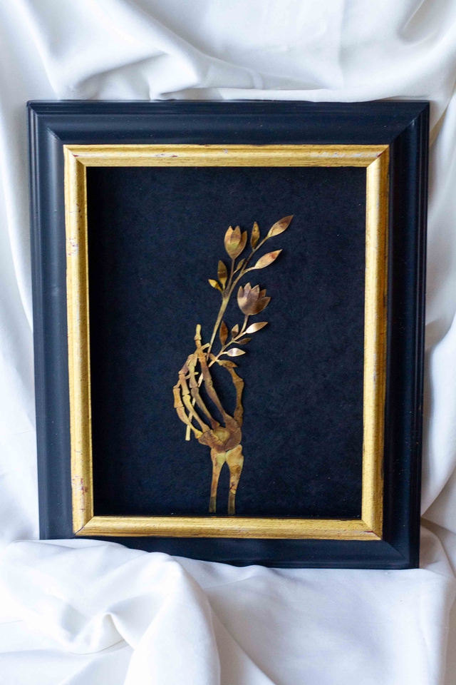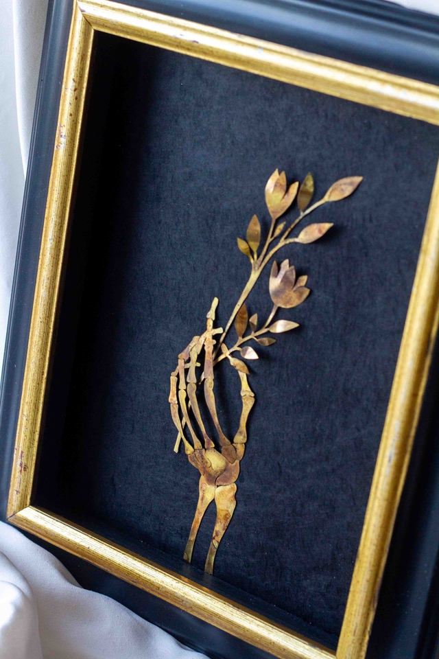 Immortel : "Un tableau qui symbolise l’amour éternel. La main du trépas et la beauté éphémère des fleurs nous dessinent une interprétation de la perpétuité de l'amour à travers les cycles de la vie et de la nature. "