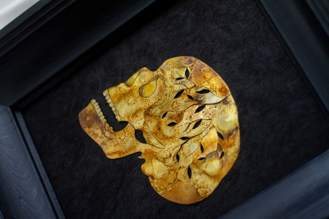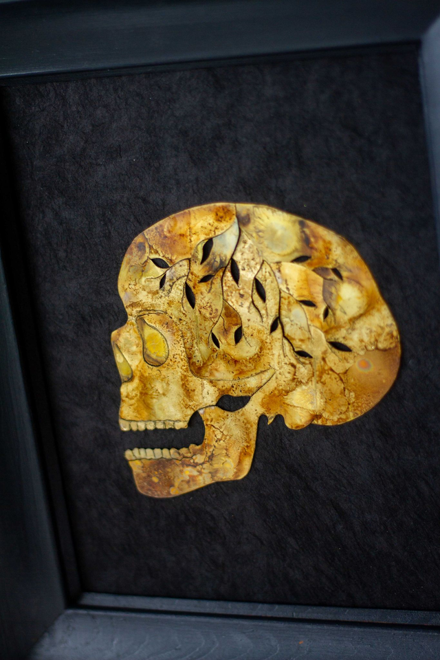Illustration en laiton dessinée et découpée à la main. Oxydation sans produit chimique . Cadre en bois noir.