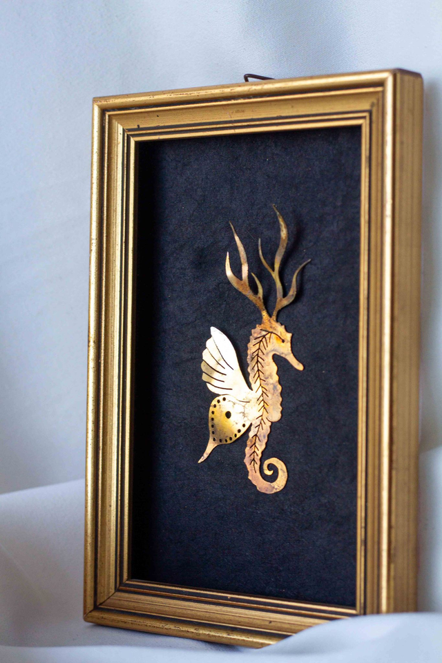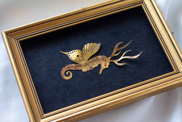 Illustration en laiton dessinée et découpée à la main. Oxydation sans produit chimique . Cadre ancien sans vitre en bois doré.